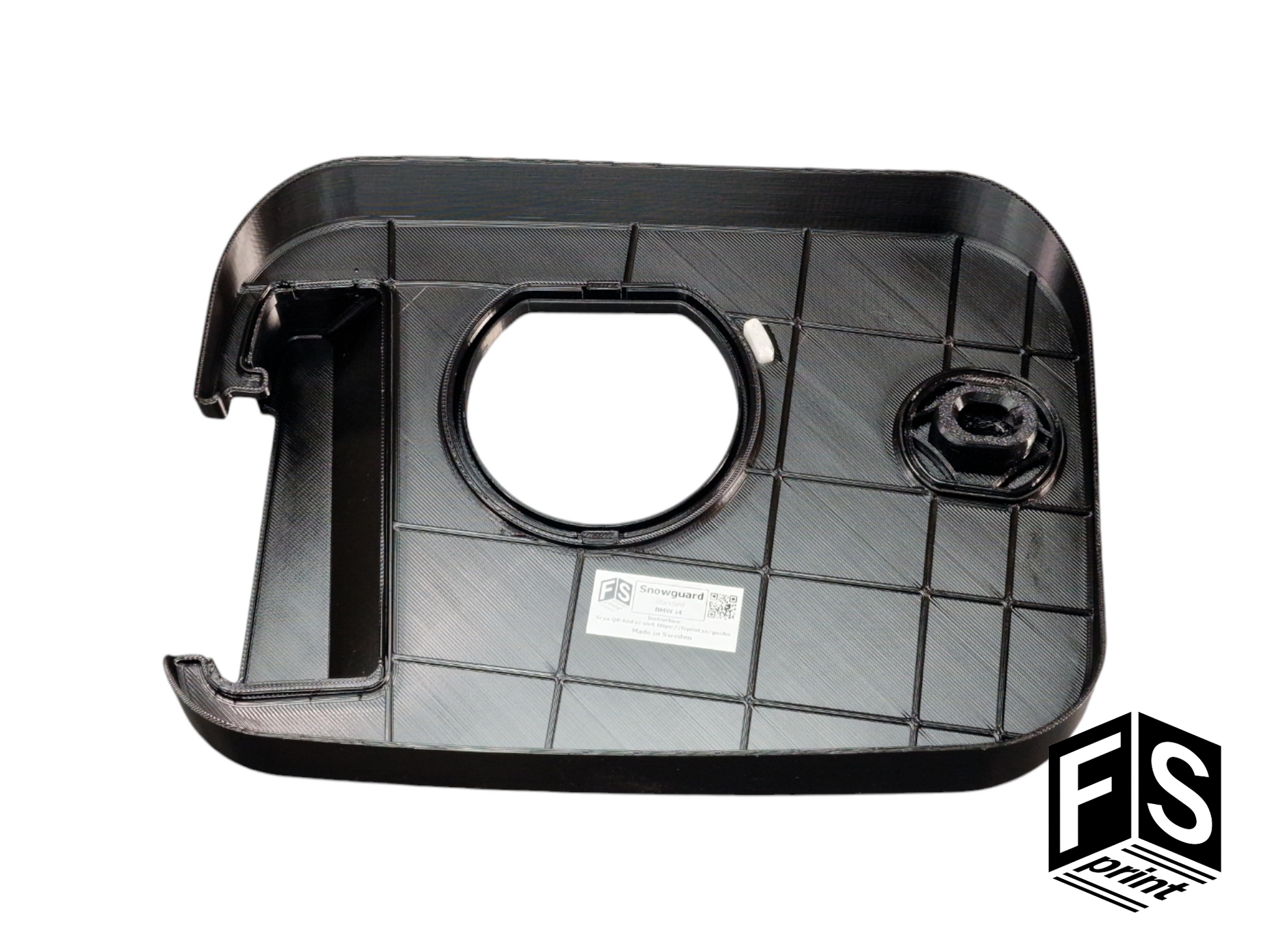 Skyddet hakas på gångjärnsarmen och låses fast m.h.a. ett vred vid laddluckans låsmekanism och skyddar utrymmet från oönskade snömängder.