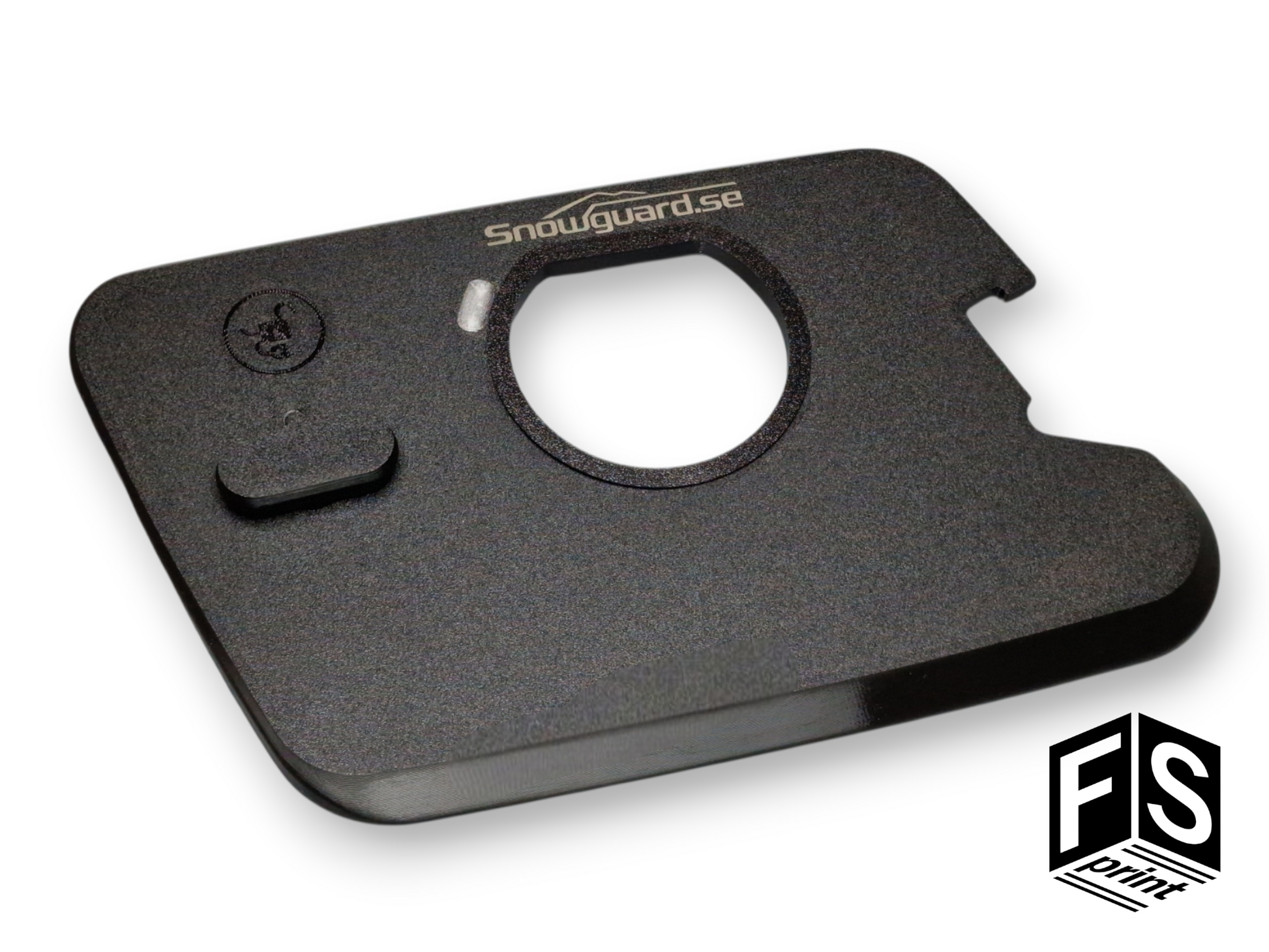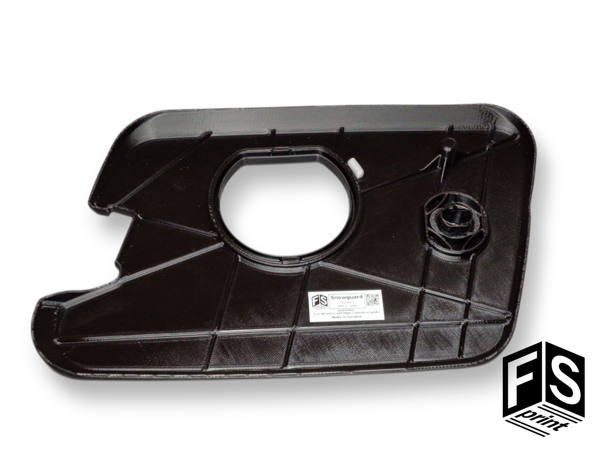 Skyddet hakas på gångjärnsarmen och låses fast m.h.a. ett vred vid laddluckans låsmekanism och skyddar utrymmet från oönskade snömängder.
