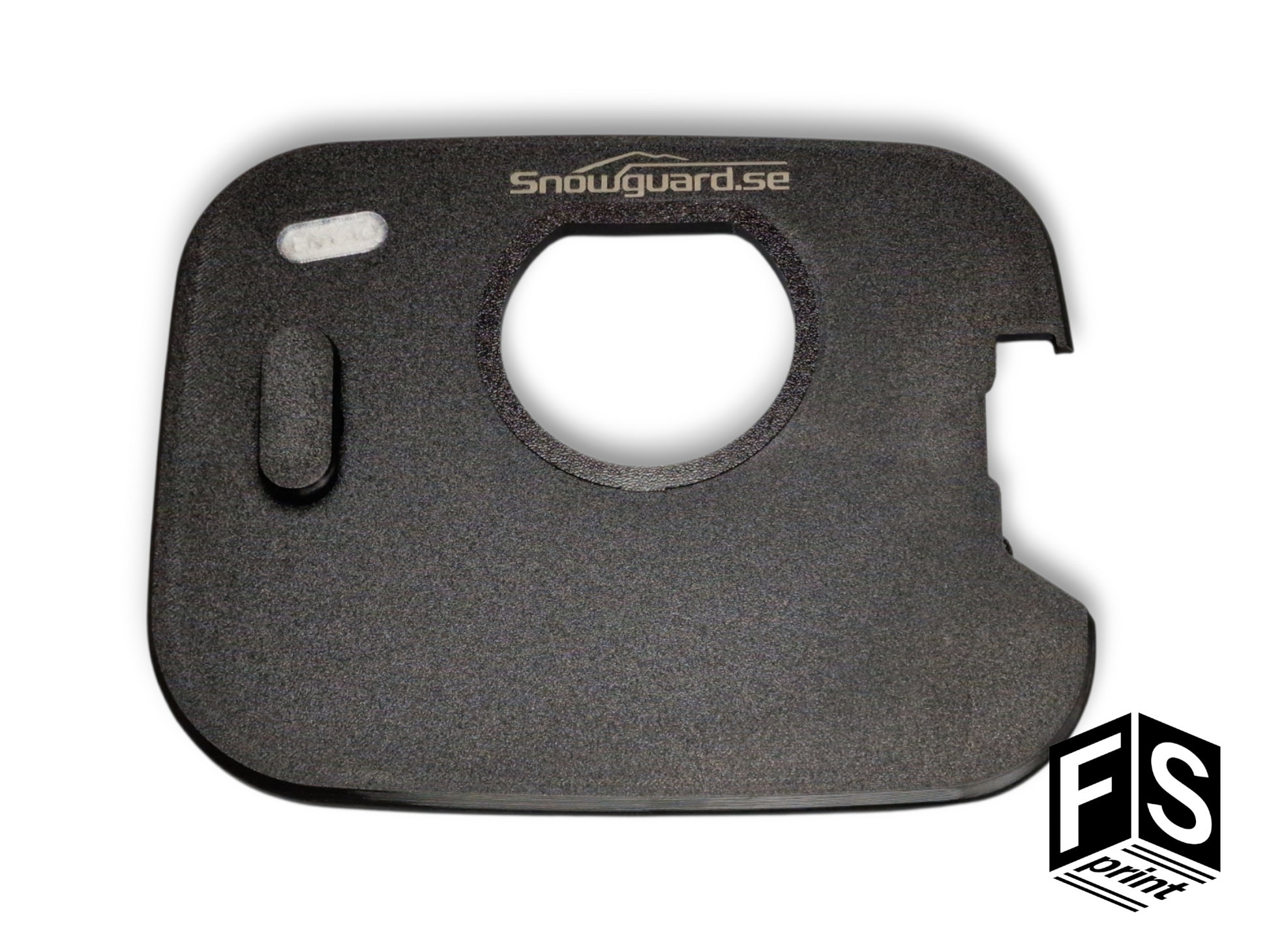 Skyddet hakas på gångjärnsarmen och låses fast m.h.a. ett vred vid laddluckans låsmekanism och skyddar utrymmet från oönskade snömängder.